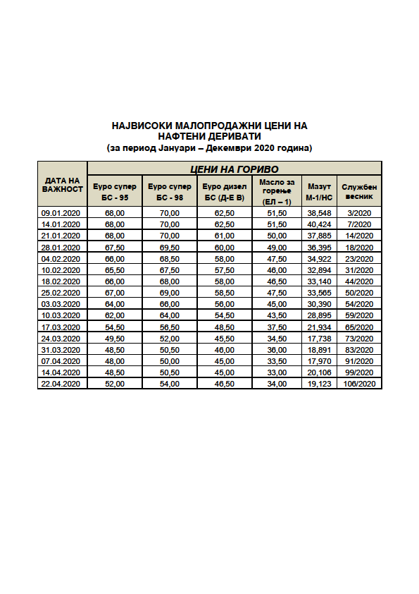 Цени на гориво објавени во 2020 година